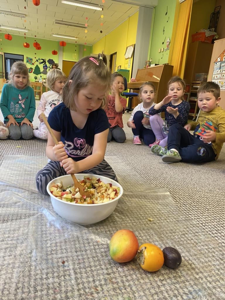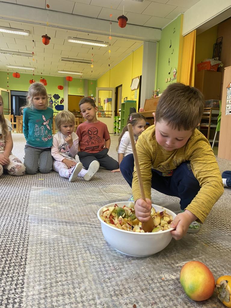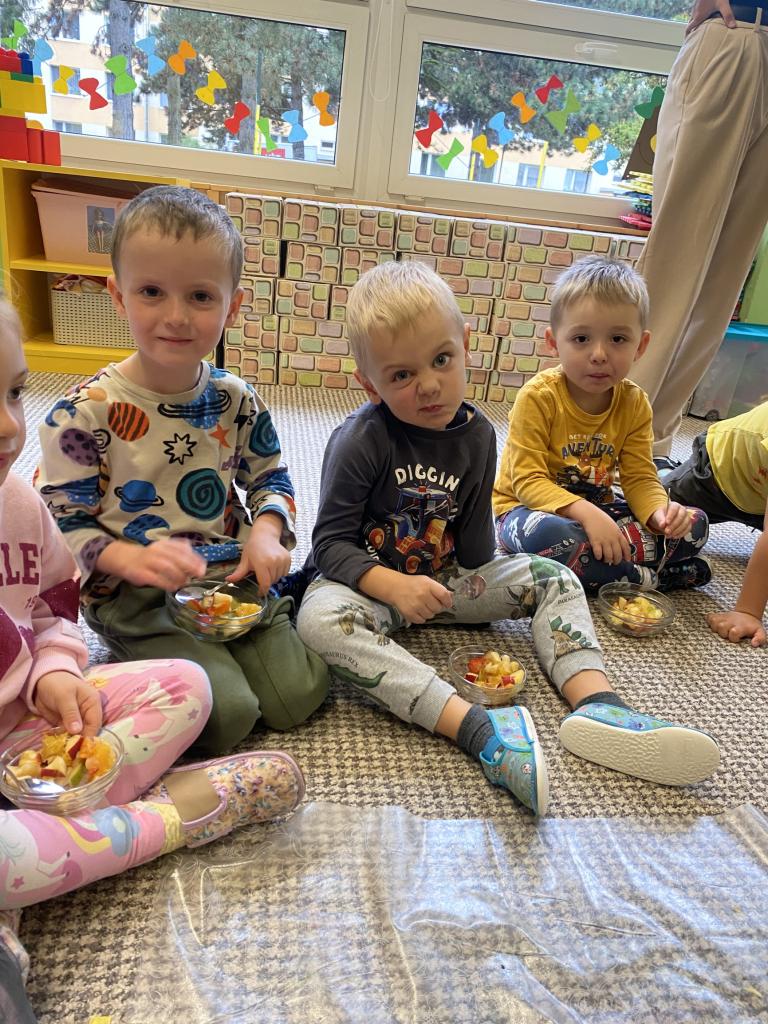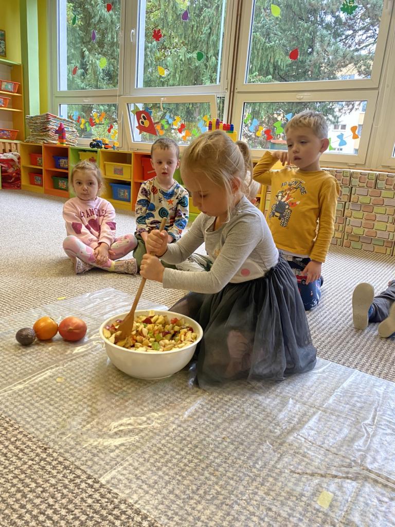 Tento týden se děti seznamovaly s ovocem všemi smysly. Tvořily, ochutnávaly, krájely, zkoumaly, stavěly a hledaly ovocné stromy v přírodě. Také si vyzkoušely zatančit mazurku.