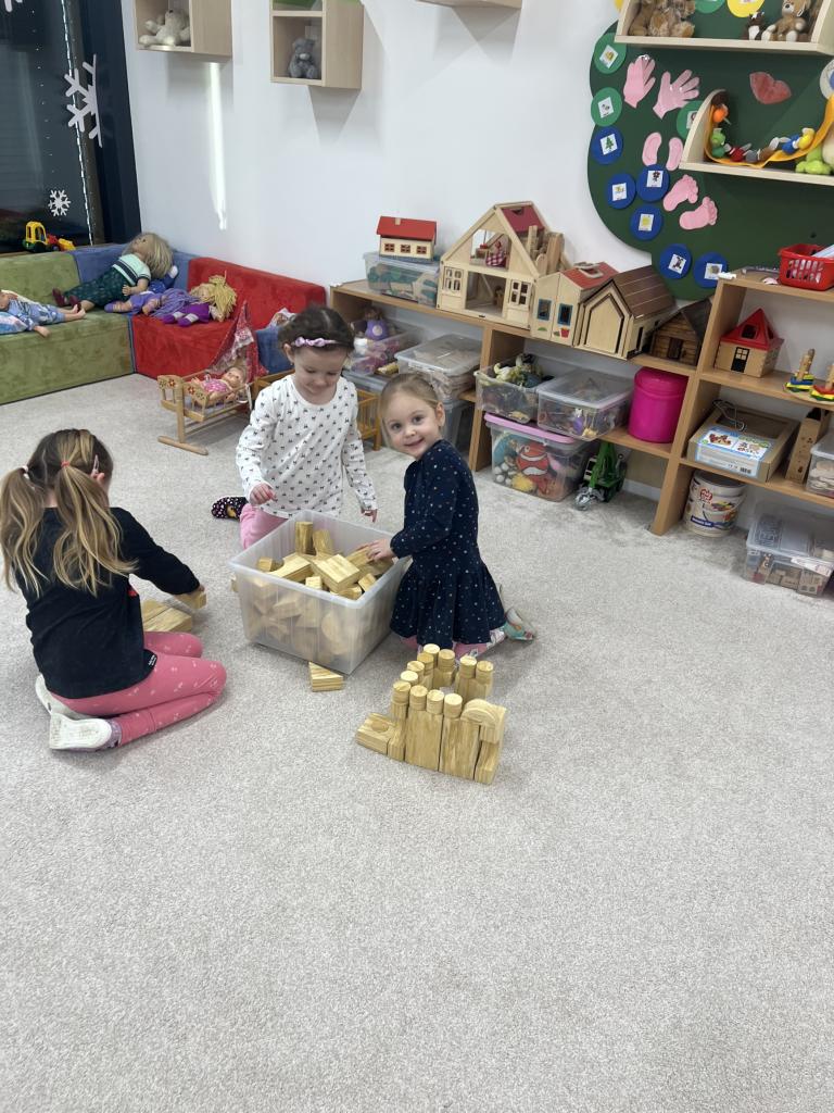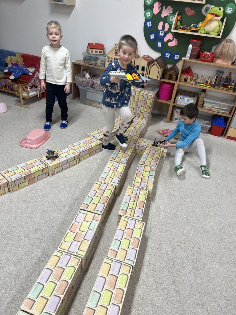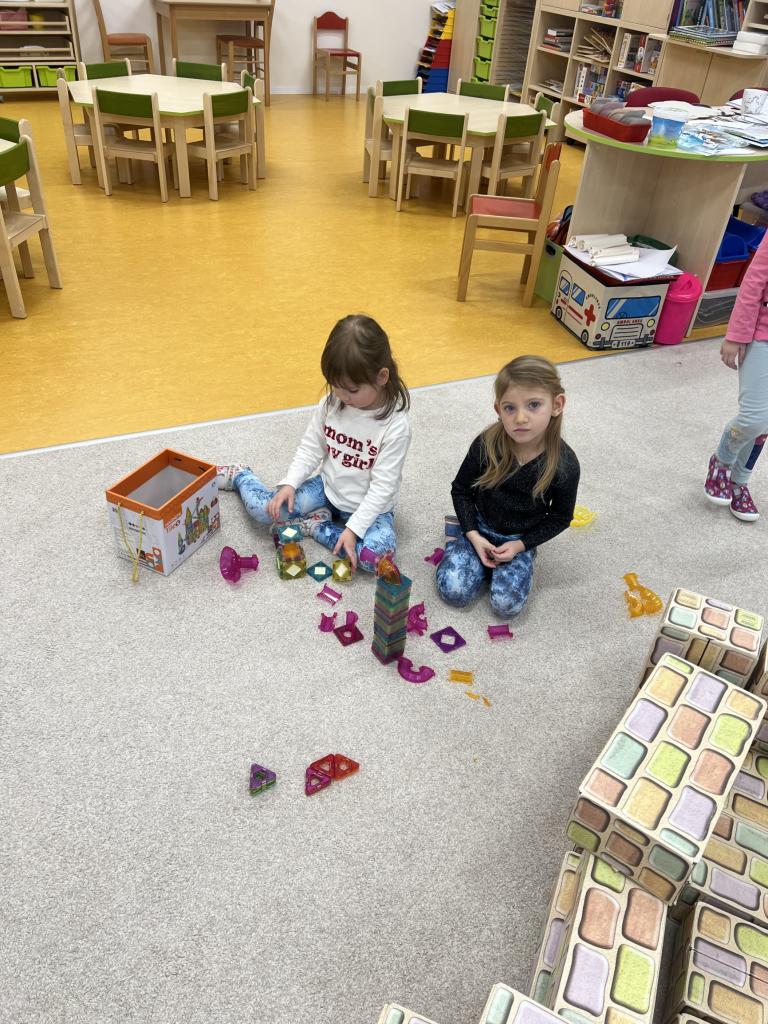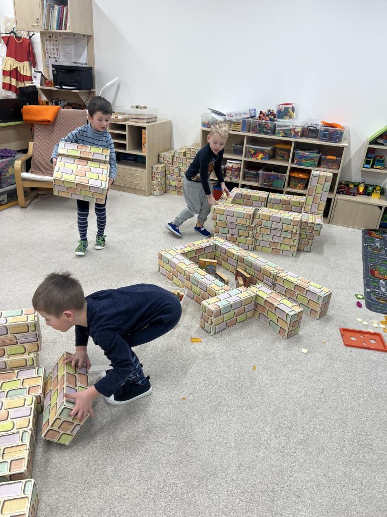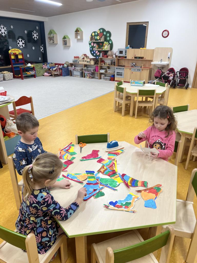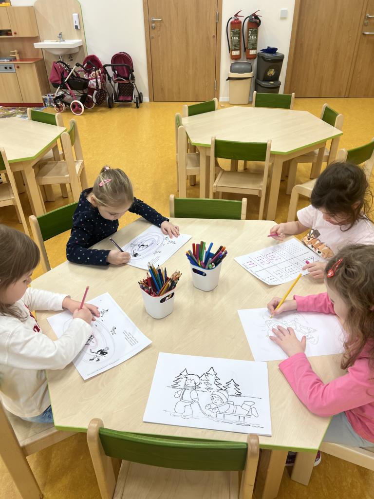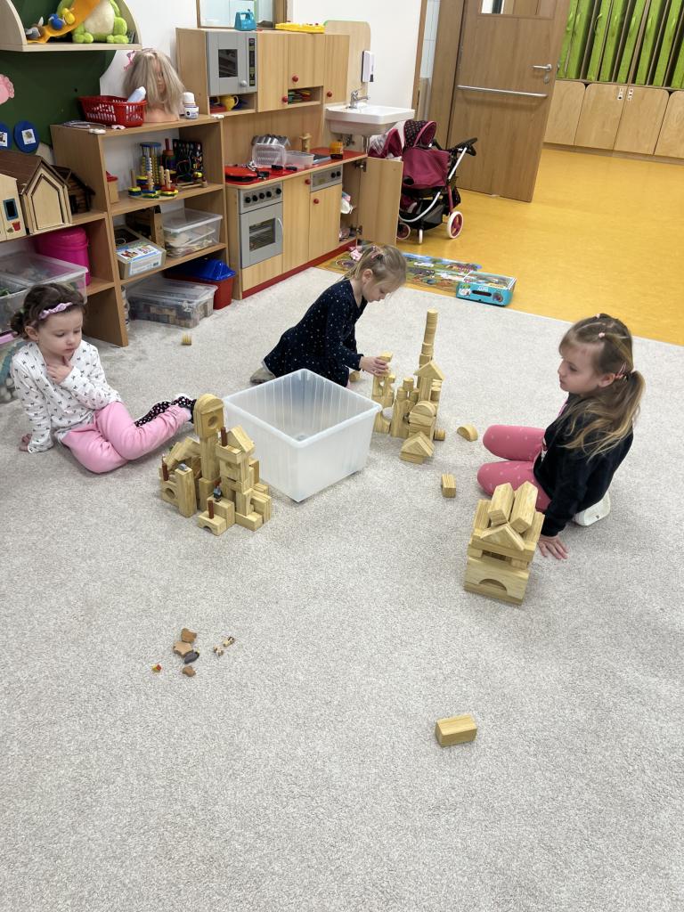Vybarvujeme tematické omalovánky, konstruujeme na koberci, skládáme puzzle, rozvíjíme matematické představy, třídíme dle barev a velikostí.