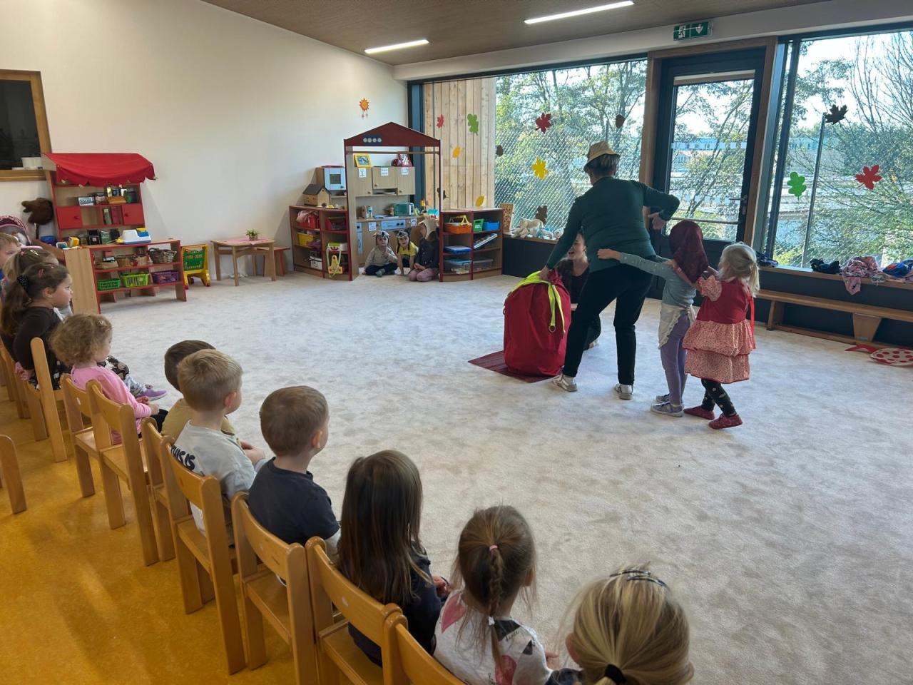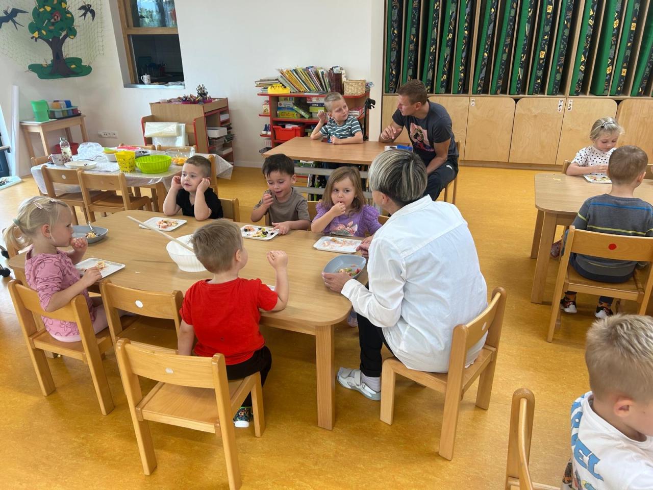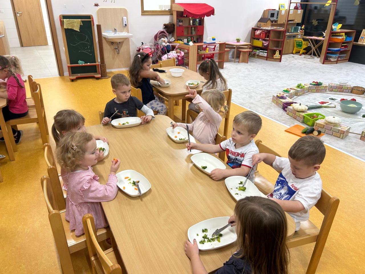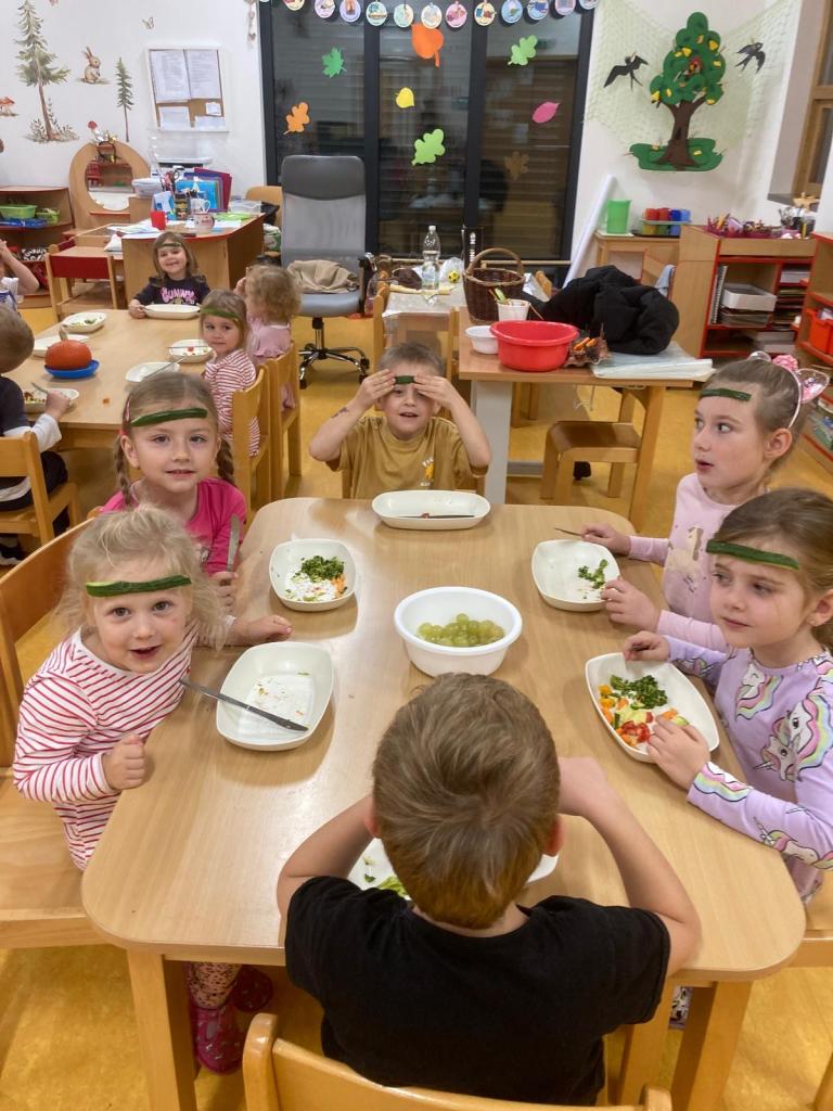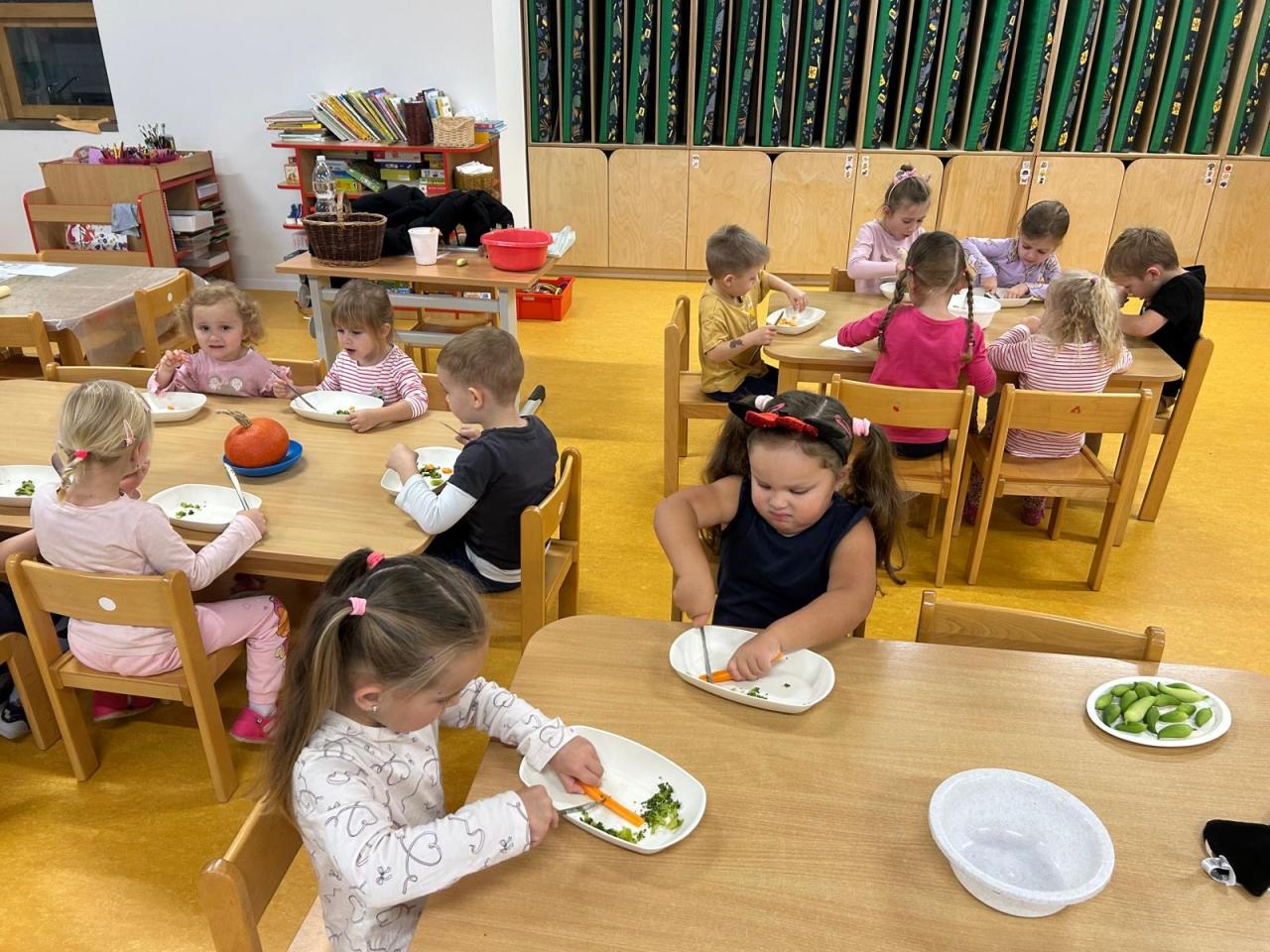 Zeleninu máme rádi, jsme s ní velcí kamarádi - společně jsme v kruhu poznávali a pojmenovávali různé druhy zeleniny, hráli divadlo “O veliké řepě” a na závěr jsme ochutnali zeleninový salát.