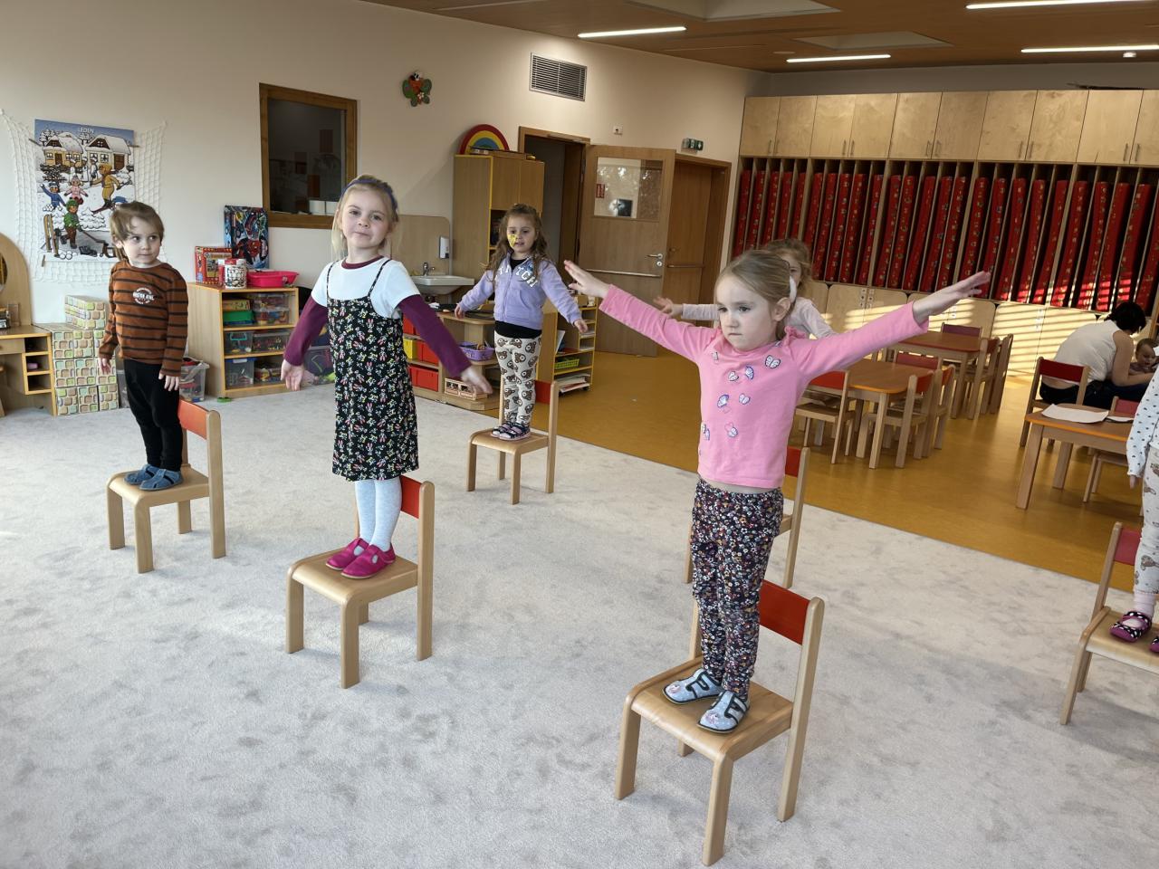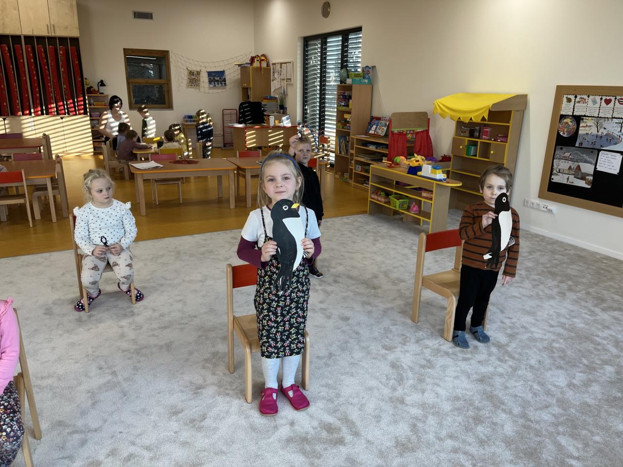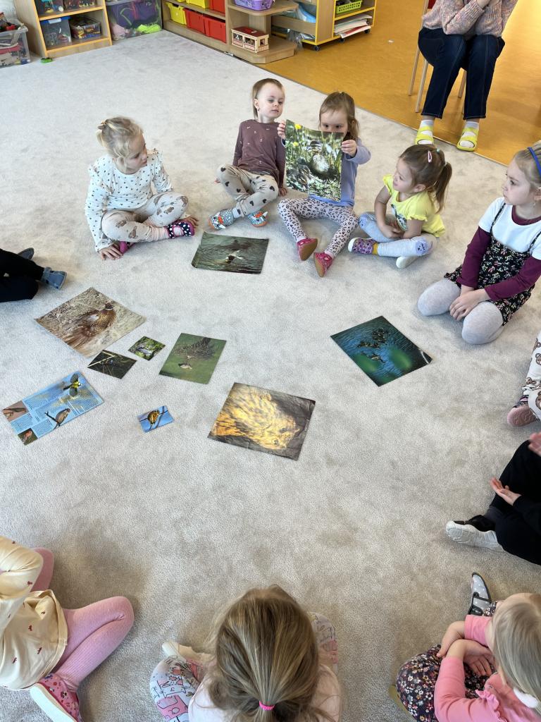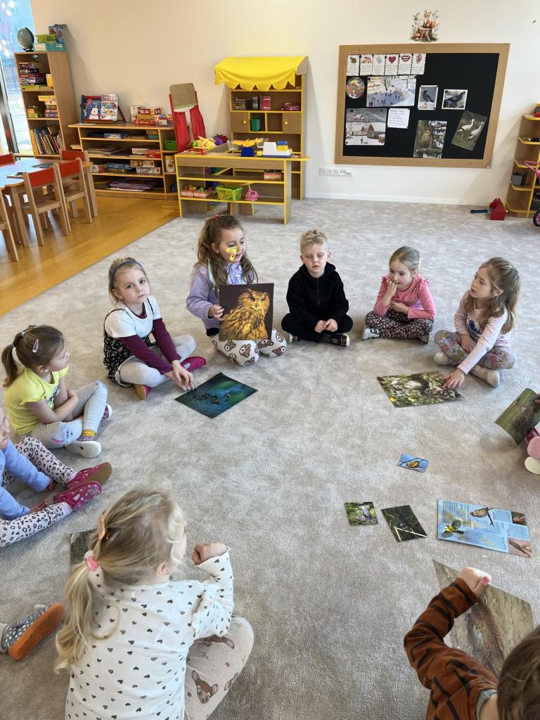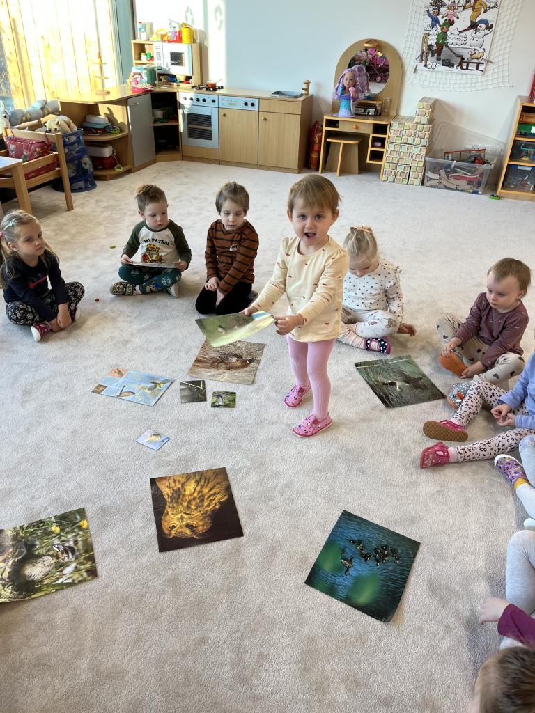 S dětmi si povídáme o ptácích, kde bydlí, čím se živí a k čemu jim slouží peří. Skládáme tematické puzzle, cvičíme - dětská jóga v kruhu, hry na prostorovou orientaci. Starší a předškolní děti procvičují pojmy (vedle, za, před, v)